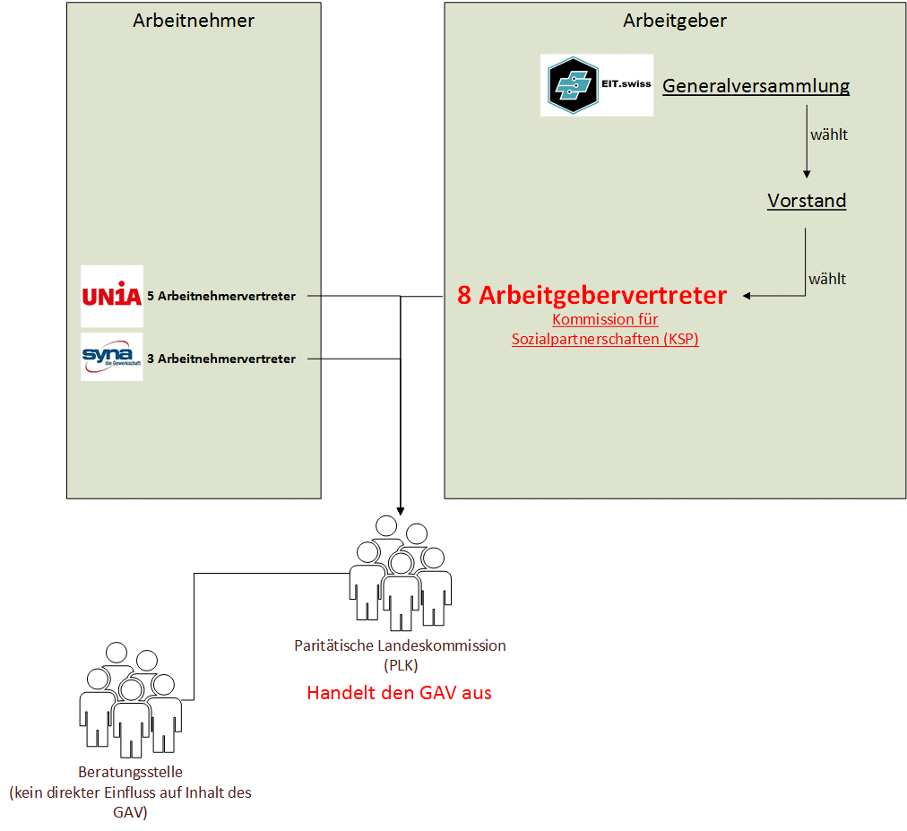 Aktuell liegt die Zuständigkeit für das Aushandeln und festlegen des GAV bei der PLK, welche, welche zu 50/50 aus Vertretern der Arbeitgebern und Arbeitnehmern besteht. Die Kommission für Sozialpartnerschaften (KSP) vertritt hierbei die Anliegen der Arbeitgeber.